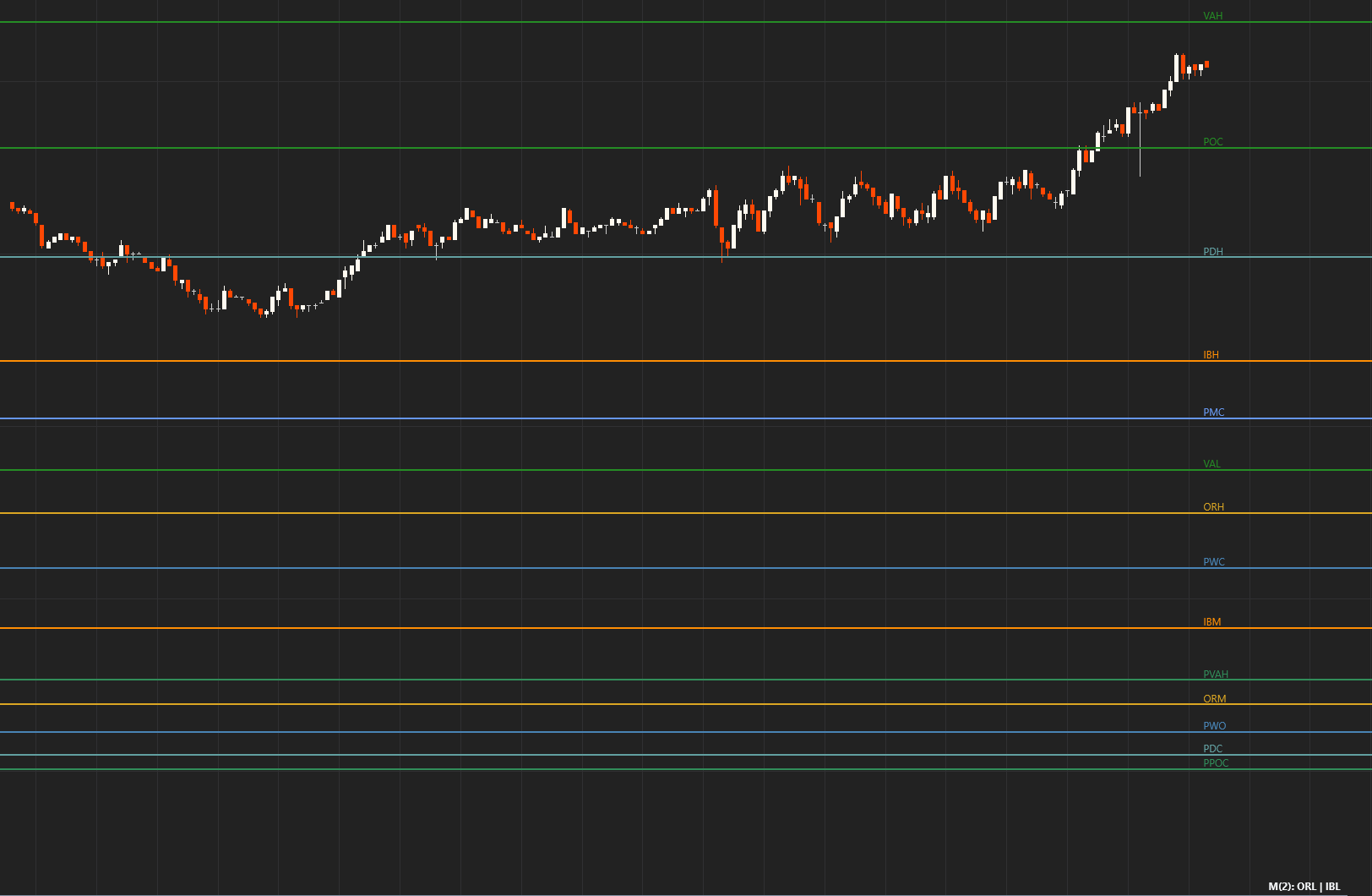The opening range captures the first N minutes of the session - a well-established institutional reference window. The initial balance is the classic market profile concept: the first 60 minutes of trade, defining the range that sets the day's tone.